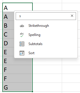 What do I input in the search box? “Strikethrough” of course. The fact is, I’ve got what I need with just one letter input, for this scenario: