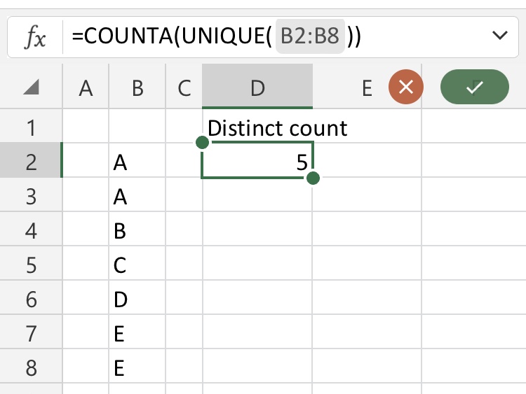 With the introduction of UNIQUE function, doing a distinct count with formula becomes easy. Look at this: