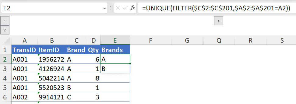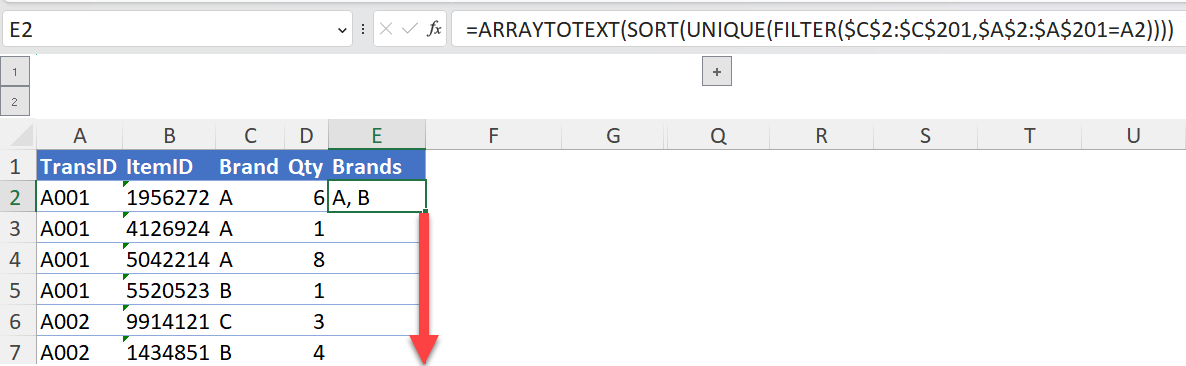 Still remember our task? We need to create a helper column to indicate all brands involved in a transaction. That’s why we need a single-cell result so that we can copy it down to fill up the entire helper column.