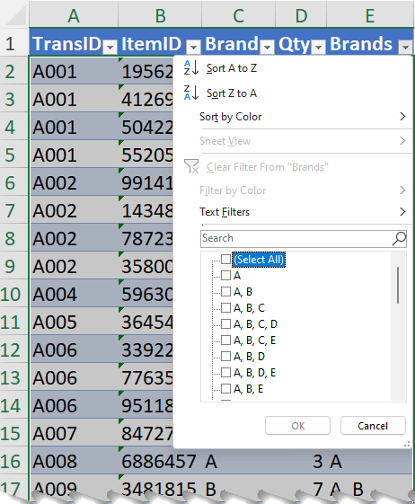 This step is subtle but important. Let’s look at transaction “A009”. In the transaction, Brand B was input before Brand A. As a result, the formula returns an array of {“B”; “A”} instead.