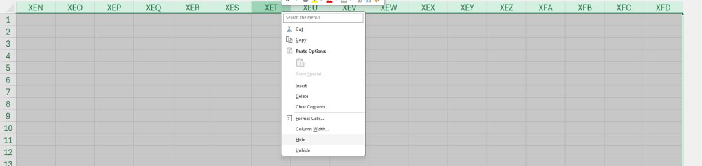 Did you know there are 16384 columns and 1048576 rows on a worksheet? We have the flexibility to navigate any cells within this large range! Nevertheless, this is NOT what we want some time. Think about when you have created a wonderful report or dashboard, you want your audiences to stay focus on the range with information. A simple way to achieve this is to hide all unwanted columns and rows.